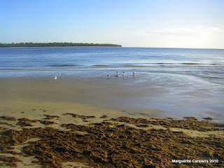 The sand is littered with debris from soldier crabs which are plentiful in this area. By the old tree trunk embedded in the sand the fishermen pump for yabbies for bait.
